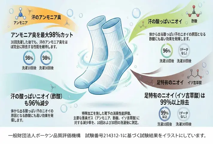 悪臭の原因となる「アンモニア・酢酸・イソ吉草酸」を、肌側に使った特殊繊維が吸着・分解。